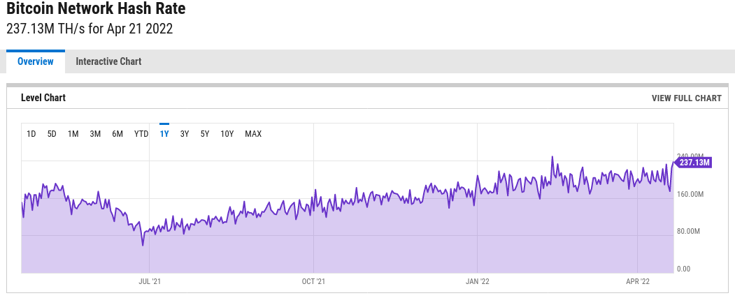 Para hacer un cálculo (al voleo) primero debemos conocer cuánto es la capacidad de cómputo de la red, el famoso “hashrate”, que se mide en Terahash por segundo (TH/s). La capacidad de la red aparece en el siguiente gráfico: